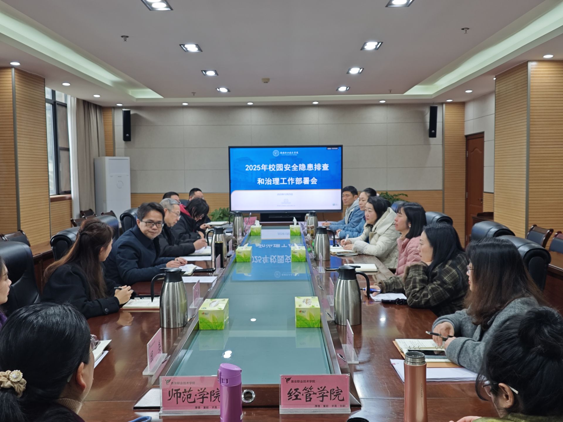 为进一步夯实校园安全基础,有效预防和化解各类安全风险,保障师生生命财产安全和校园和谐稳定。学校于12月25日,在经开区校区303会议室召开了校园安全隐患排查和治理工作部署会。学校党委常委、副校长陈冬冬出席会议并作工作部署。武装部(保卫处)、宣传统战部、学生处、教务处、基建后勤处、继续教育与国际交流处、团委、各涉生二级学院及物业公司负责人参加会议。