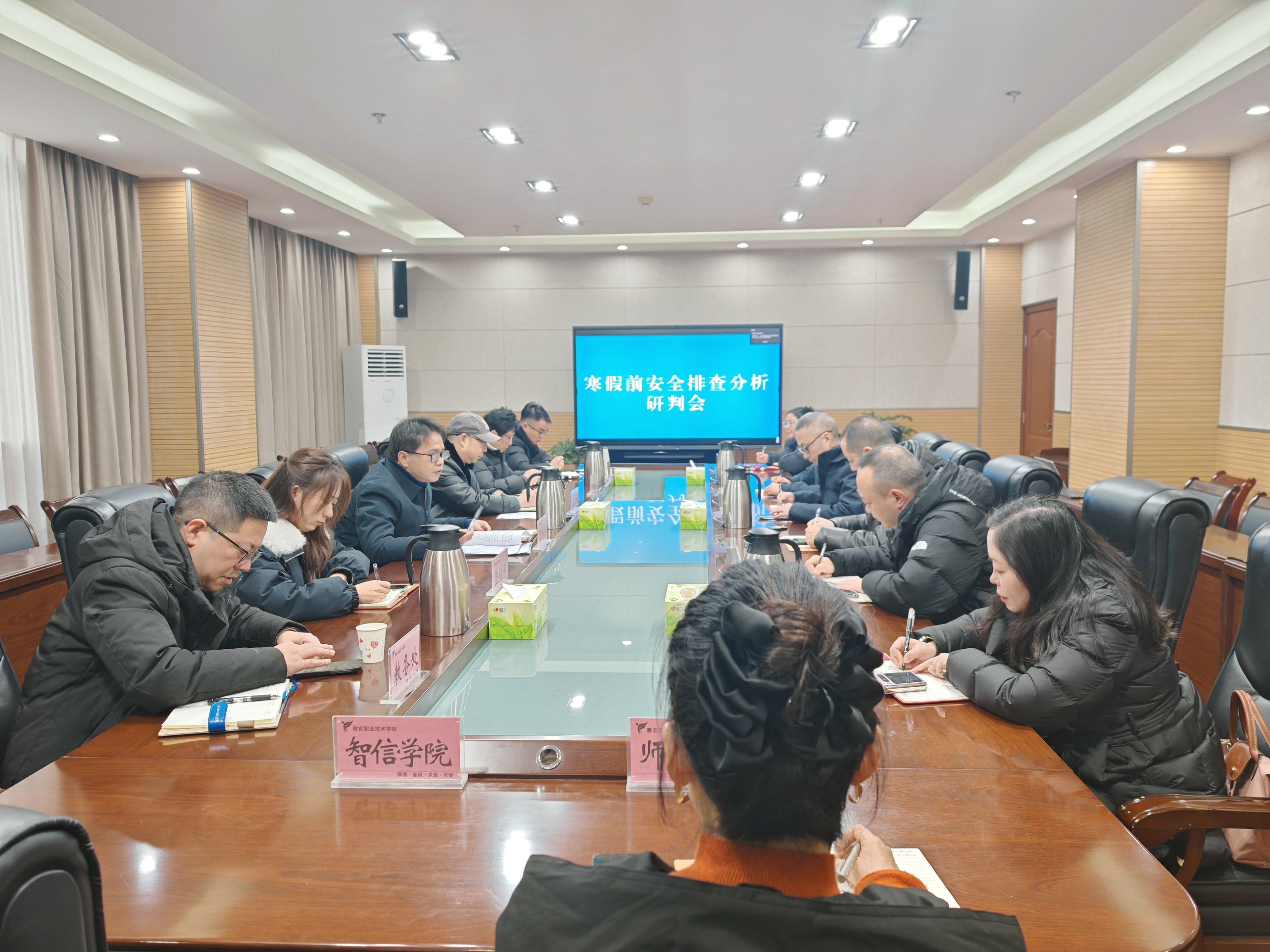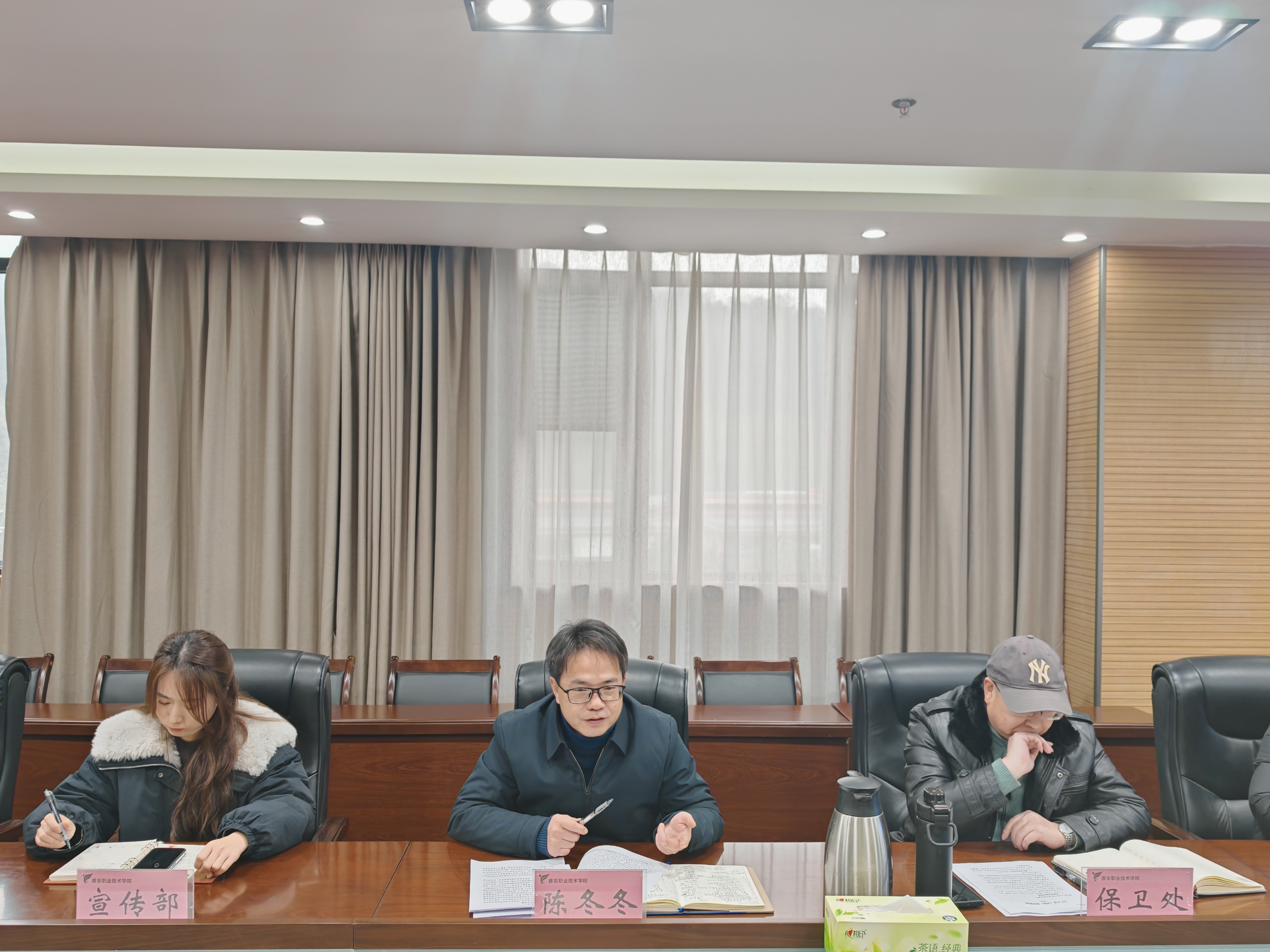 检查结束后,全体参与人员在经开区校区303会议室集中召开寒假前安全排查分析研判会。会上,陈冬冬对两校区检查情况进行了汇总通报,并传达了省教育厅关于寒假前校园安全管理相关文件精神。他强调,各职能部门和二级学院必须牢固树立安全底线思维,压实责任,确保各项整改措施落到实处;要加强寒假期间值班值守与信息报送,如遇突发情况及时上报、及时处置。同时需切实做好留校学生的服务保障与安全教育,全力维护校园假期安全稳定。