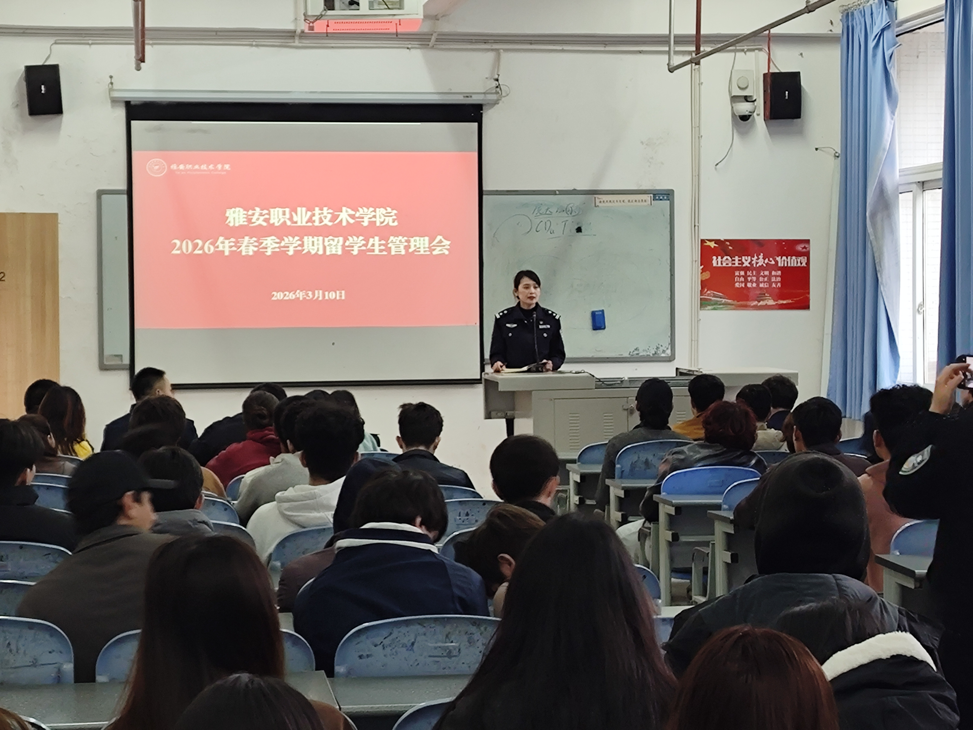 为进一步增强留学生安全防范意识,普及法律法规及学校管理规定规章,3月10日下午,学校邀请雅安市公安局出入境管理支队和雅安市公安局雨城分局警官来校,向全体在校留学生开展安全知识专题宣讲。