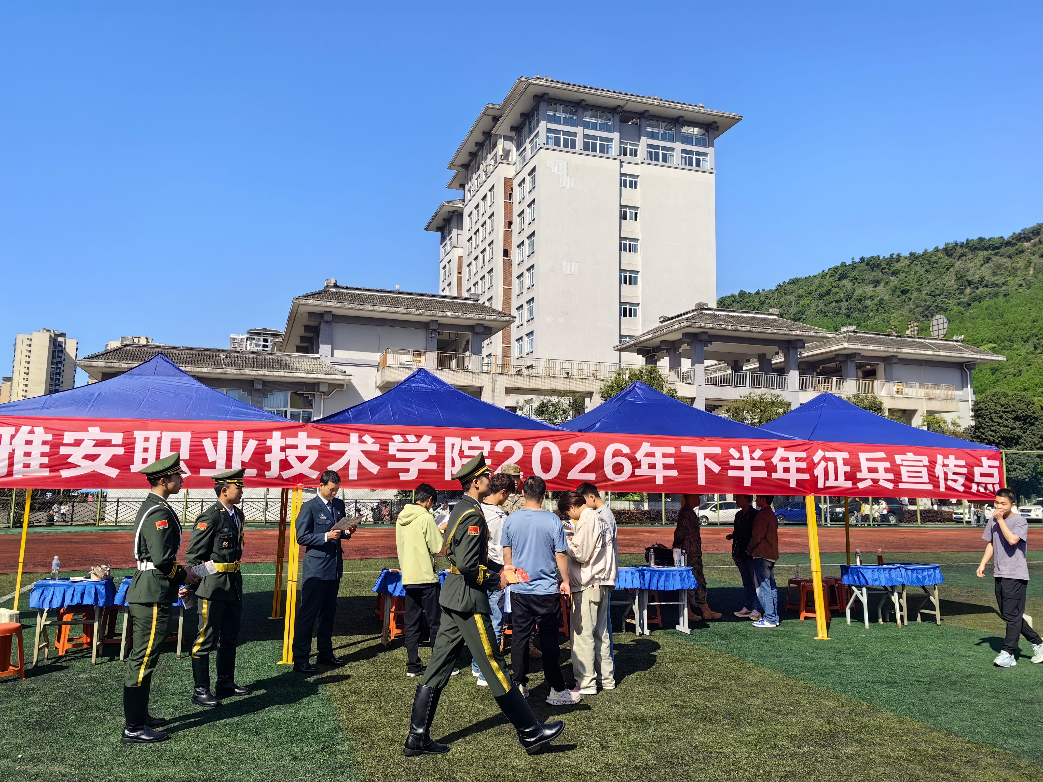 2026年4月17日,雅安职业技术学院联合雅安市征兵办公室、雨城区征兵办公室,在春季双选会现场开展征兵宣传活动,为毕业生提供“就业+参军”双轨规划,精准动员青年学子投身国防事业。